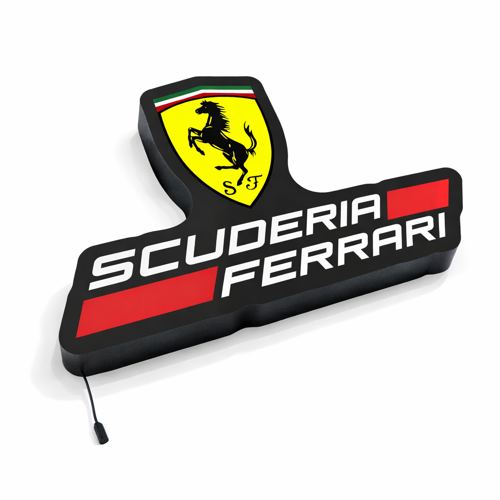 Com 50 cm de largura por 28 cm de altura, esse modelo une design moderno, iluminação LED vibrante e o icônico escudo do Cavallino Rampante, um emblema que representa décadas de glórias e batalhas nas pistas.